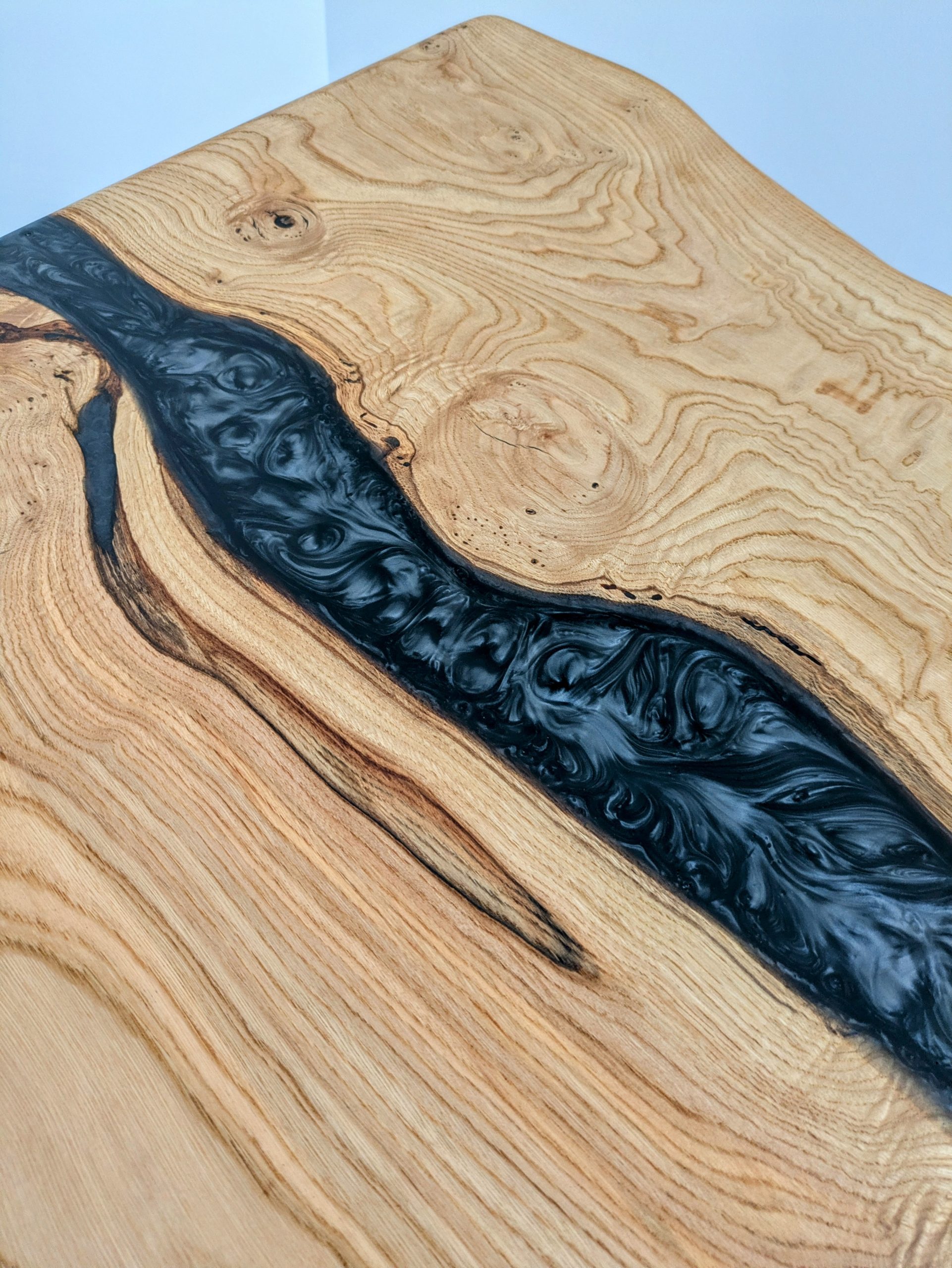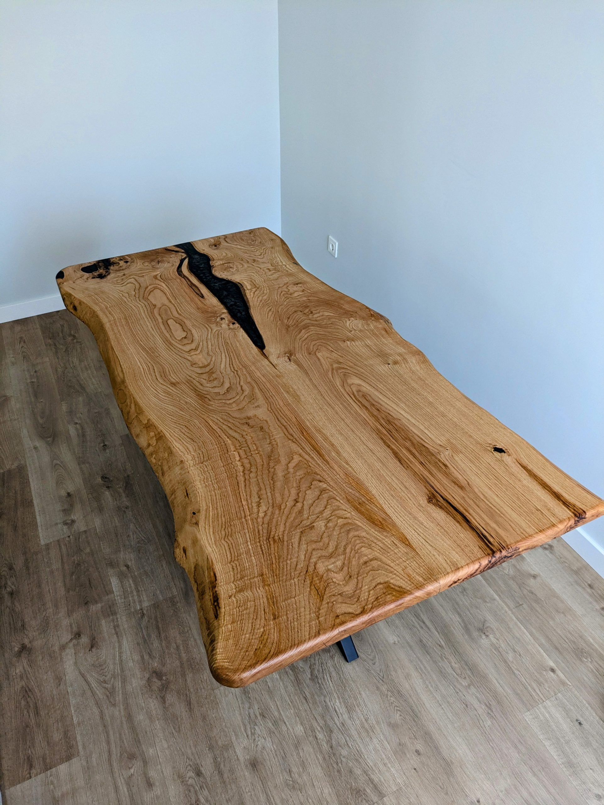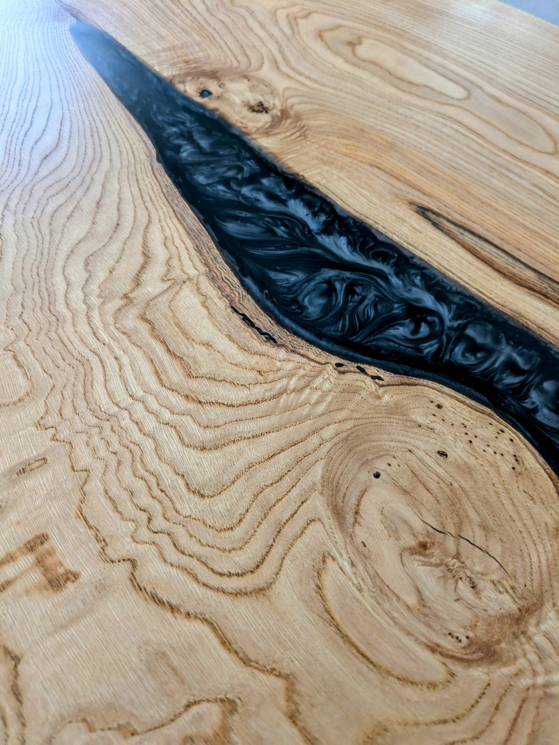 Mesa robusta y espaciosa de madera de castaño con incrustaciones en resina epoxi negra, ideal para reuniones familiares, combinando solidez y diseño artesanal.