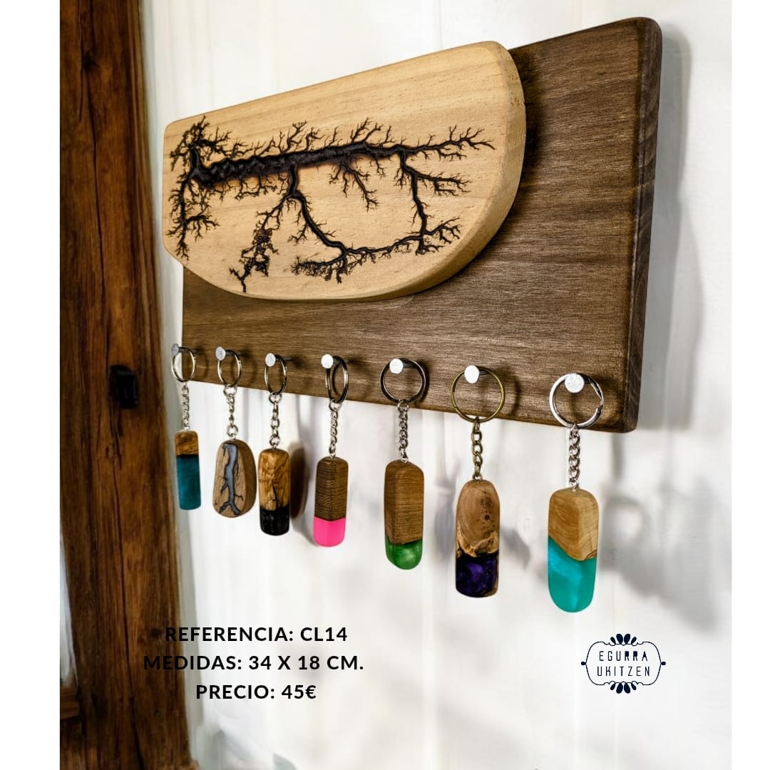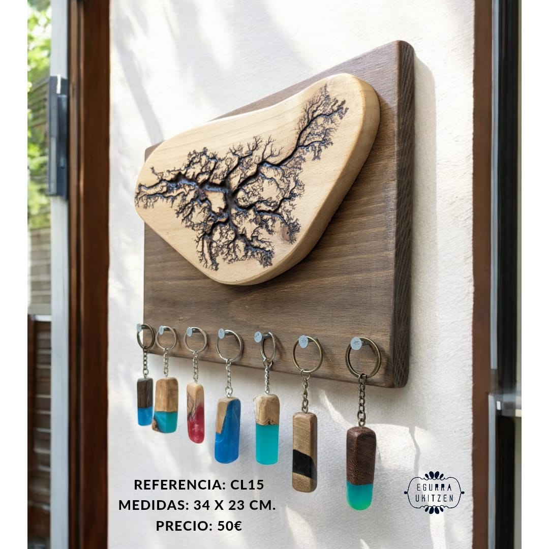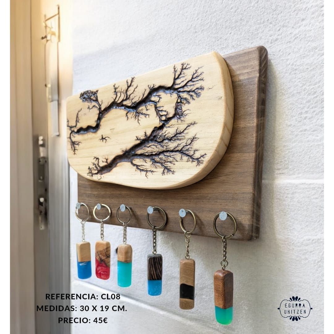 Las figuras Lichtenberg son imágenes producidas por descargas eléctricas ramificadas, arborescentes. El nombre de la arborescencia viene debido al patrón que siguen las figuras, muy parecido a la morfología arbórea. Sin embargo, se ha descubierto que las ramificaciones, nada tienen que ver con el verde vegetal, más bien poseen propiedades fractales. Reciben su nombre debido a su descubridor, Georg Christoph Lichtenberg en 1777, y son figuras que se crean al someter grandes descargas eléctricas a materiales aislantes, en nuestro caso, madera. En nuestro canal de YOUTUBE mostramos vídeos de la realización de esta técnica tan bonita, como arriesgada. Con esta técnica elaboramos colgadores de llaves como estos, todos realizados con madera recuperada y totalmente desparasitada.