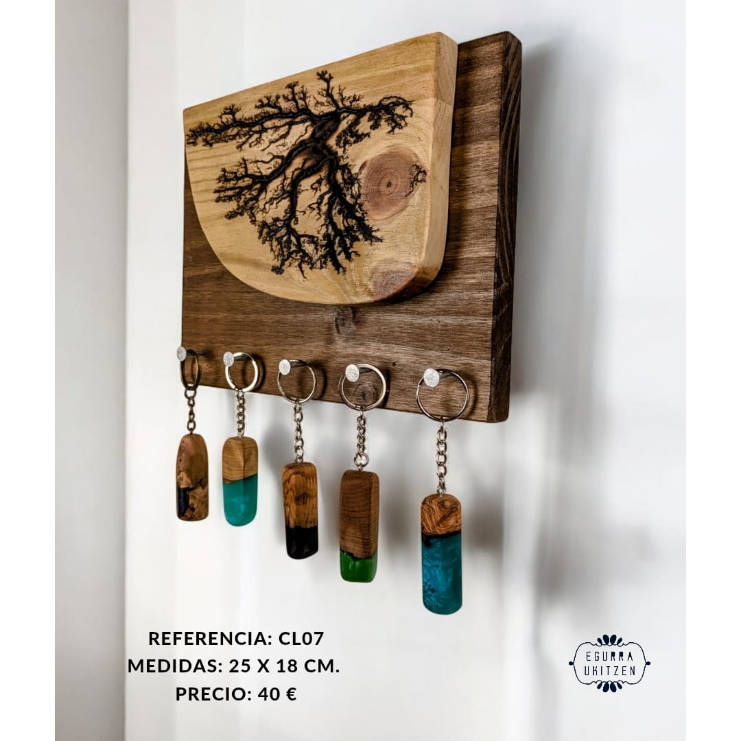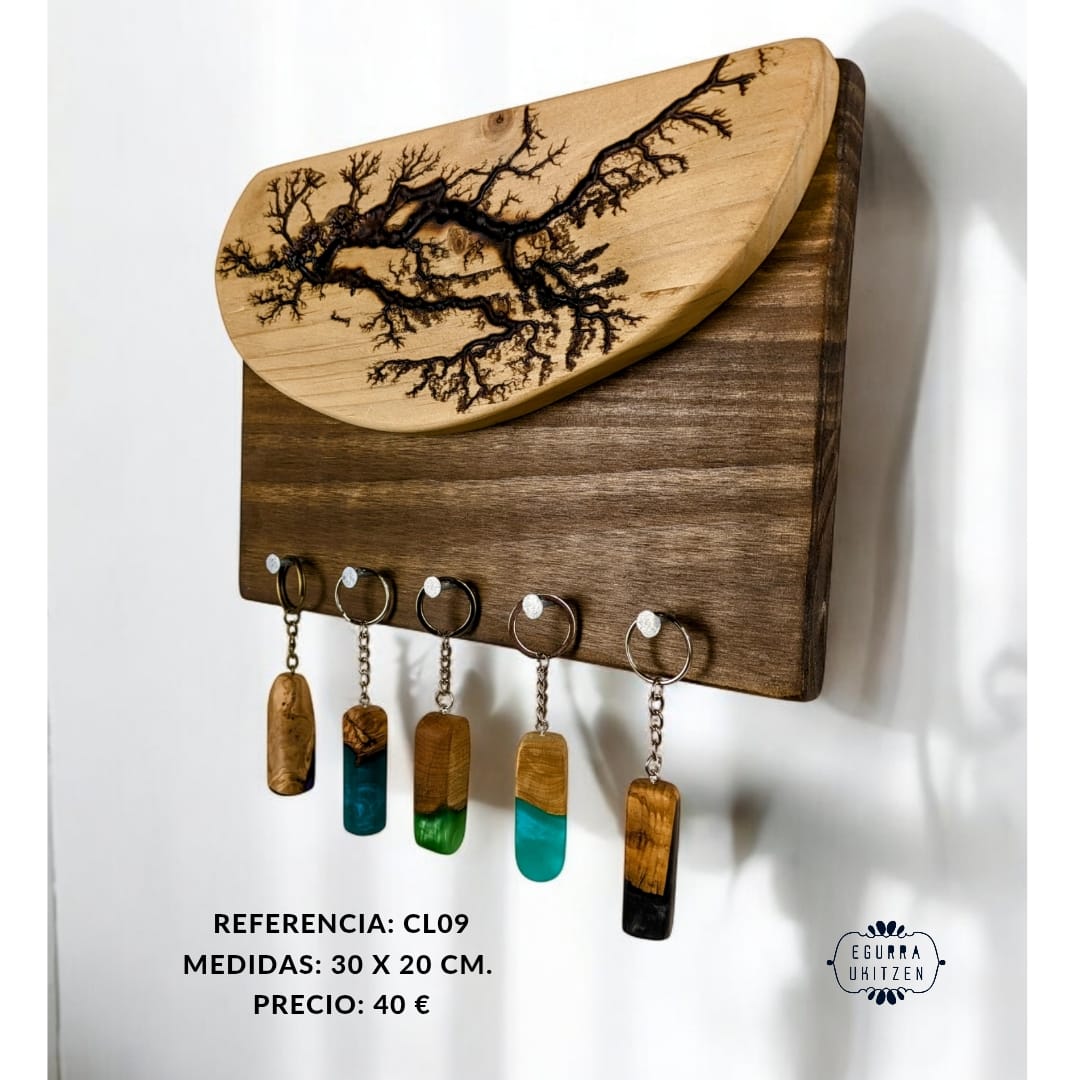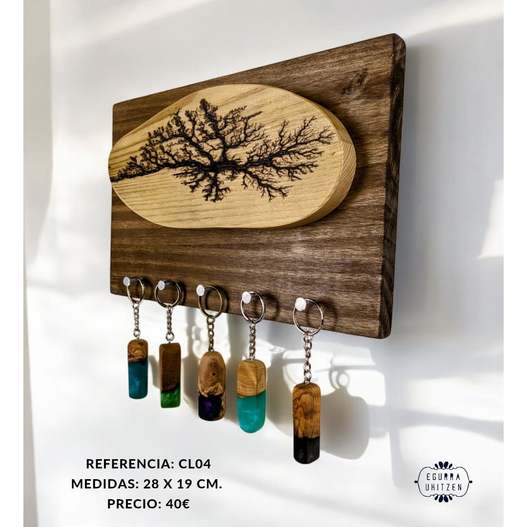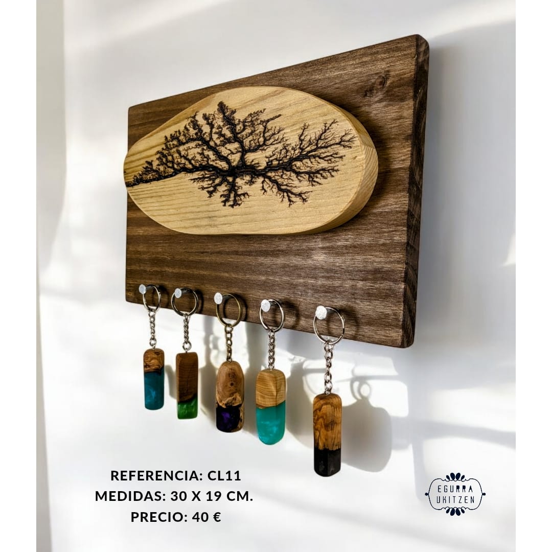 Las figuras Lichtenberg son imágenes producidas por descargas eléctricas ramificadas, arborescentes. El nombre de la arborescencia viene debido al patrón que siguen las figuras, muy parecido a la morfología arbórea. Sin embargo, se ha descubierto que las ramificaciones, nada tienen que ver con el verde vegetal, más bien poseen propiedades fractales. Reciben su nombre debido a su descubridor, Georg Christoph Lichtenberg en 1777, y son figuras que se crean al someter grandes descargas eléctricas a materiales aislantes, en nuestro caso, madera. En nuestro canal de YOUTUBE mostramos vídeos de la realización de esta técnica tan bonita, como arriesgada. Con esta técnica elaboramos colgadores de llaves como estos, todos realizados con madera recuperada y totalmente desparasitada.