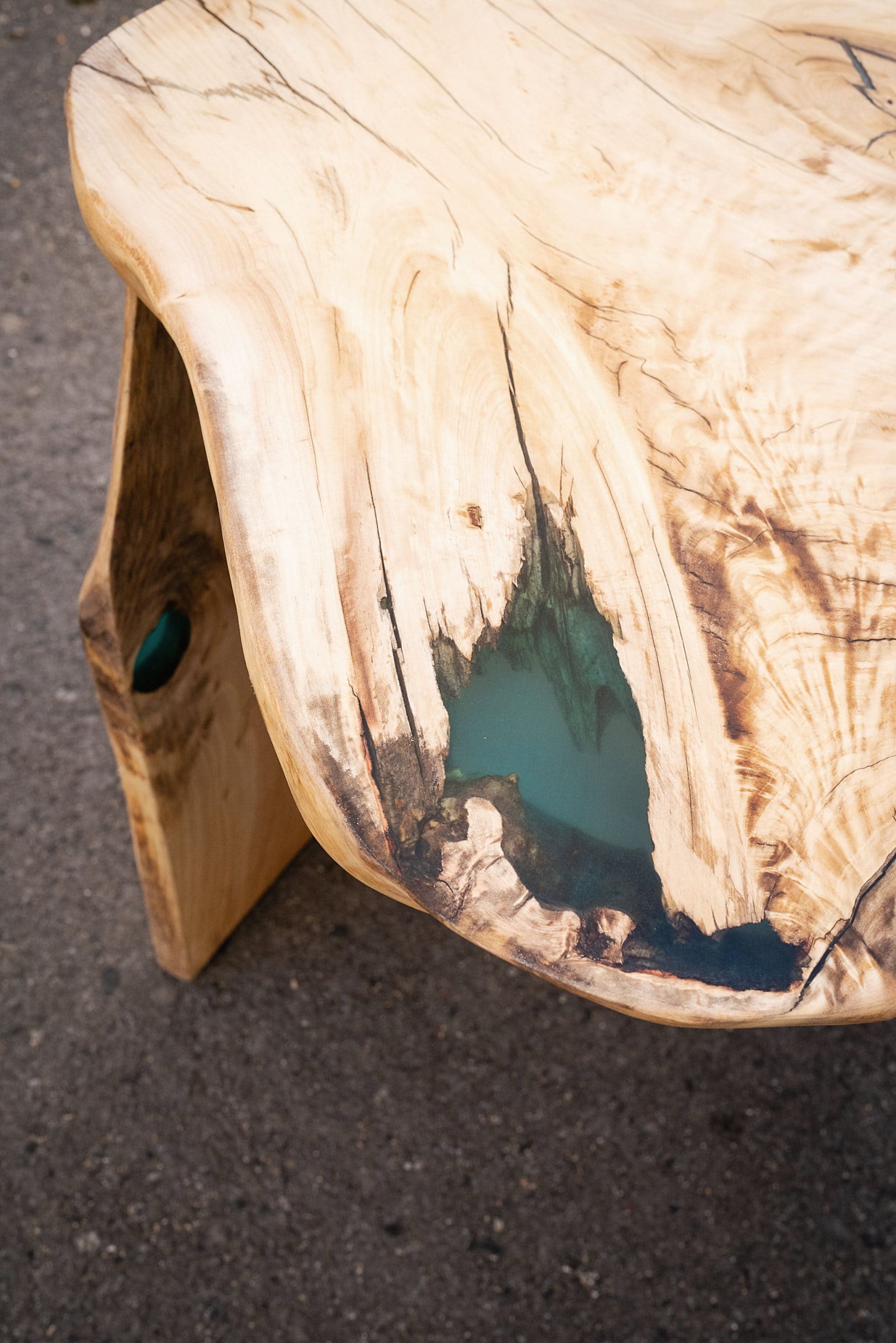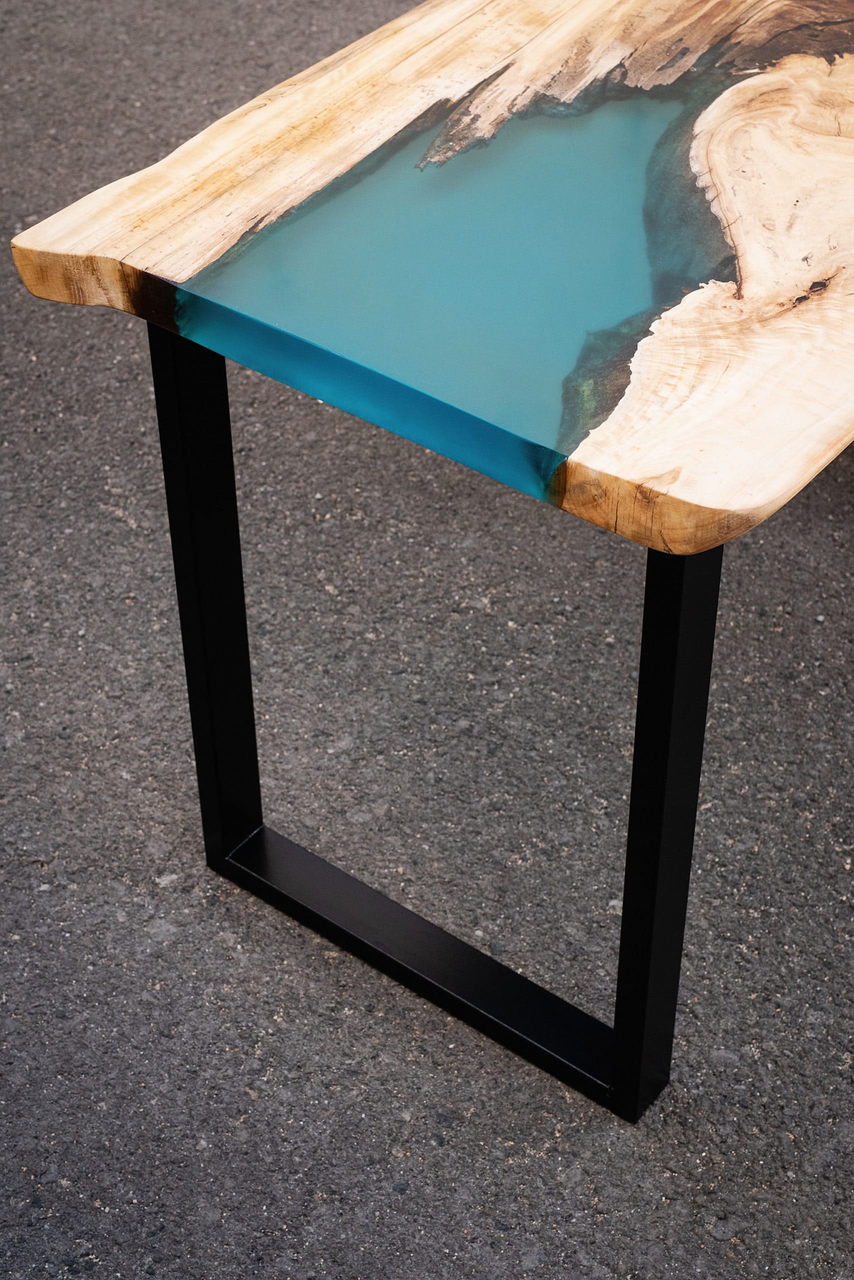 Buscando estas sensaciones e inspirándonos en el río Urederra y su agua turquesa, hemos creado este escritorio fabricado con madera de Álamo Blanco (habitual en las orillas de este río) y resina incrustada, añadiendo tinte translucido de este color tan especial.