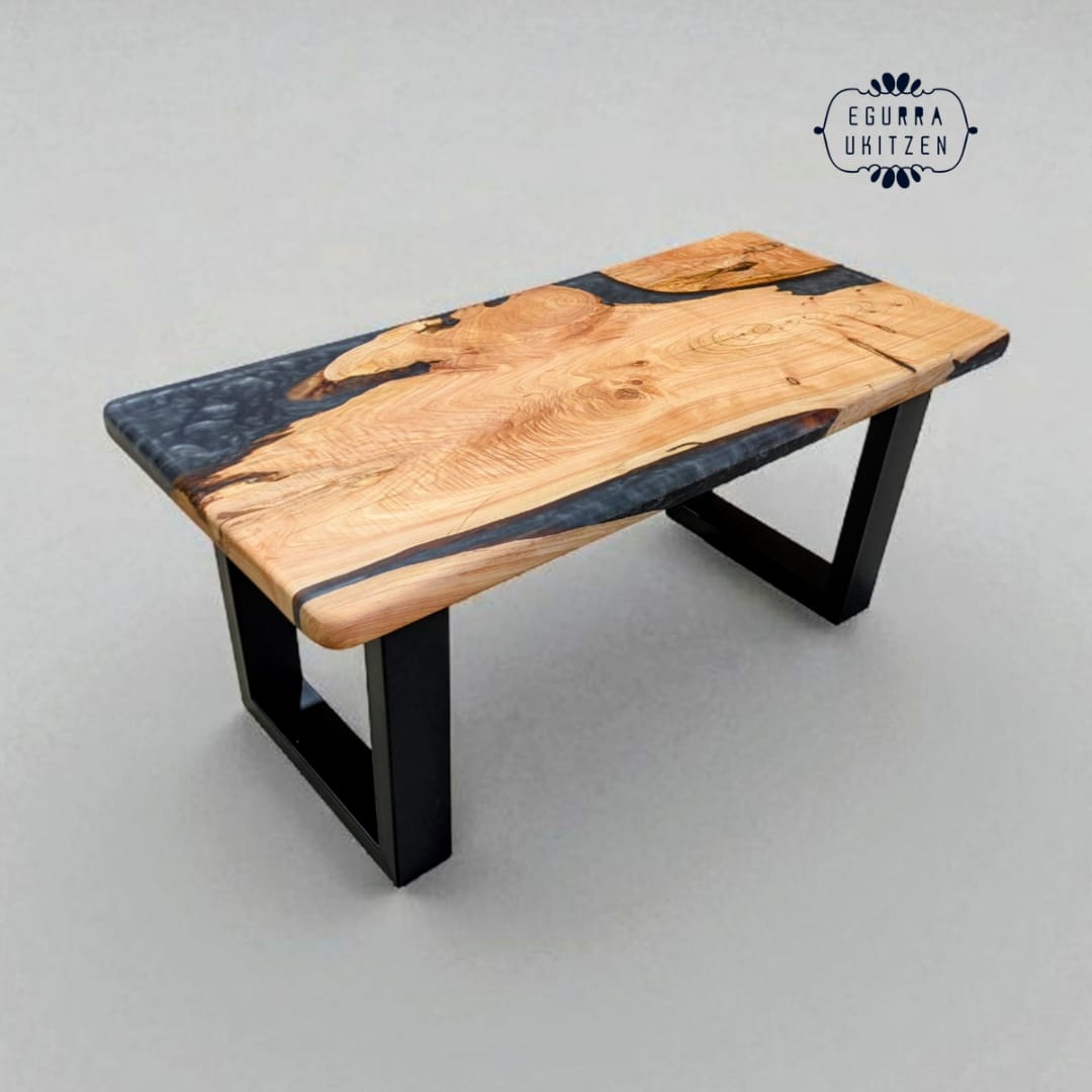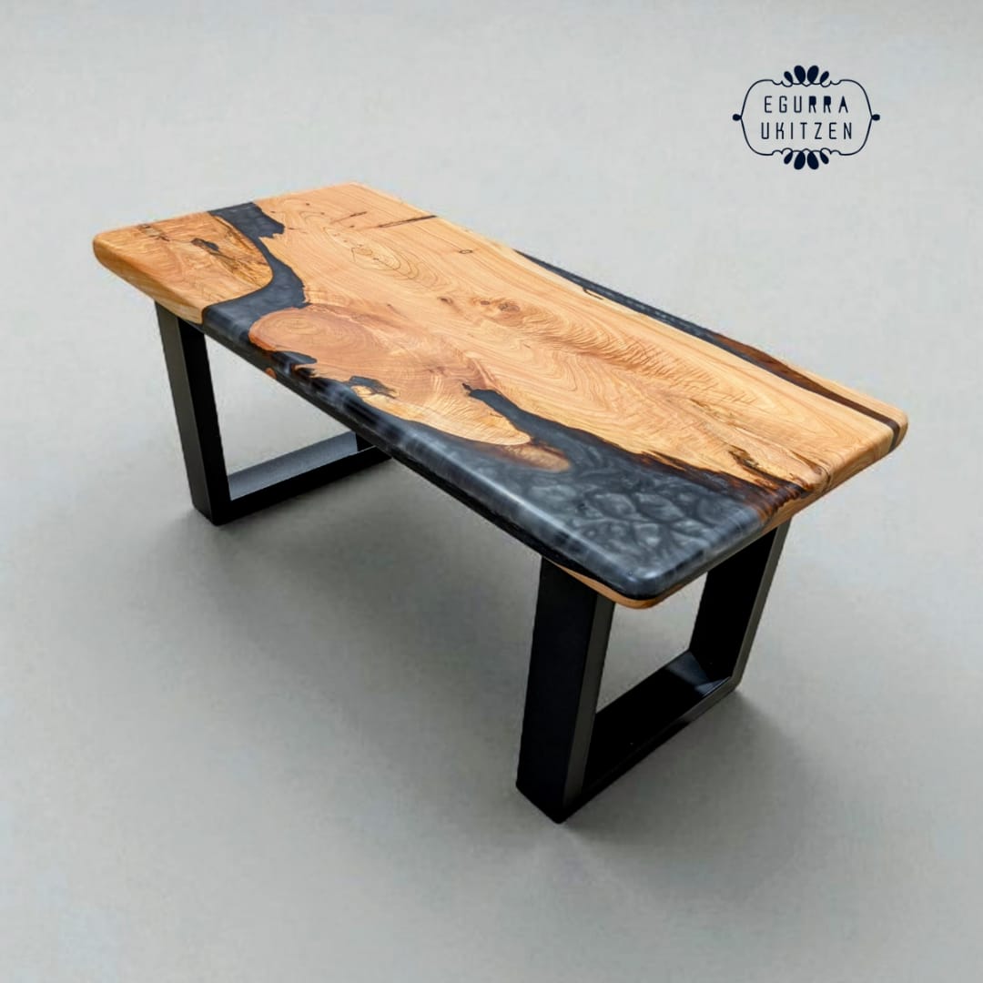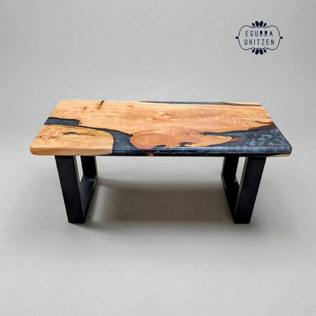 Esta pieza única combina la calidez natural de la madera de ciprés con la elegancia contemporánea de la resina negra metalizada. Su diseño orgánico resalta las vetas y texturas originales de la madera, mientras que la resina fluye entre ellas, creando un contraste sofisticado y armonioso.