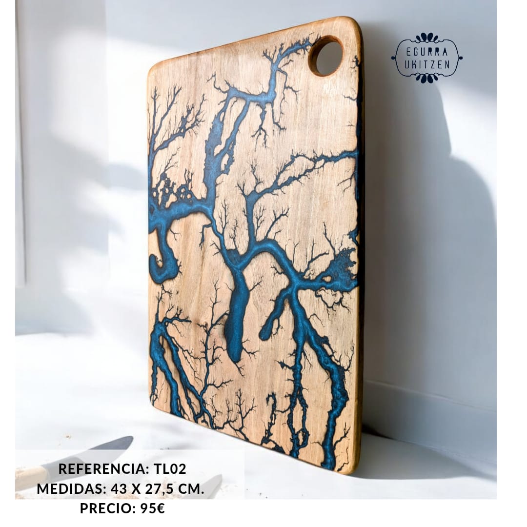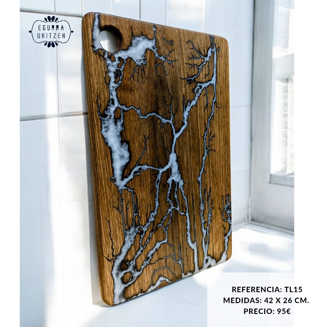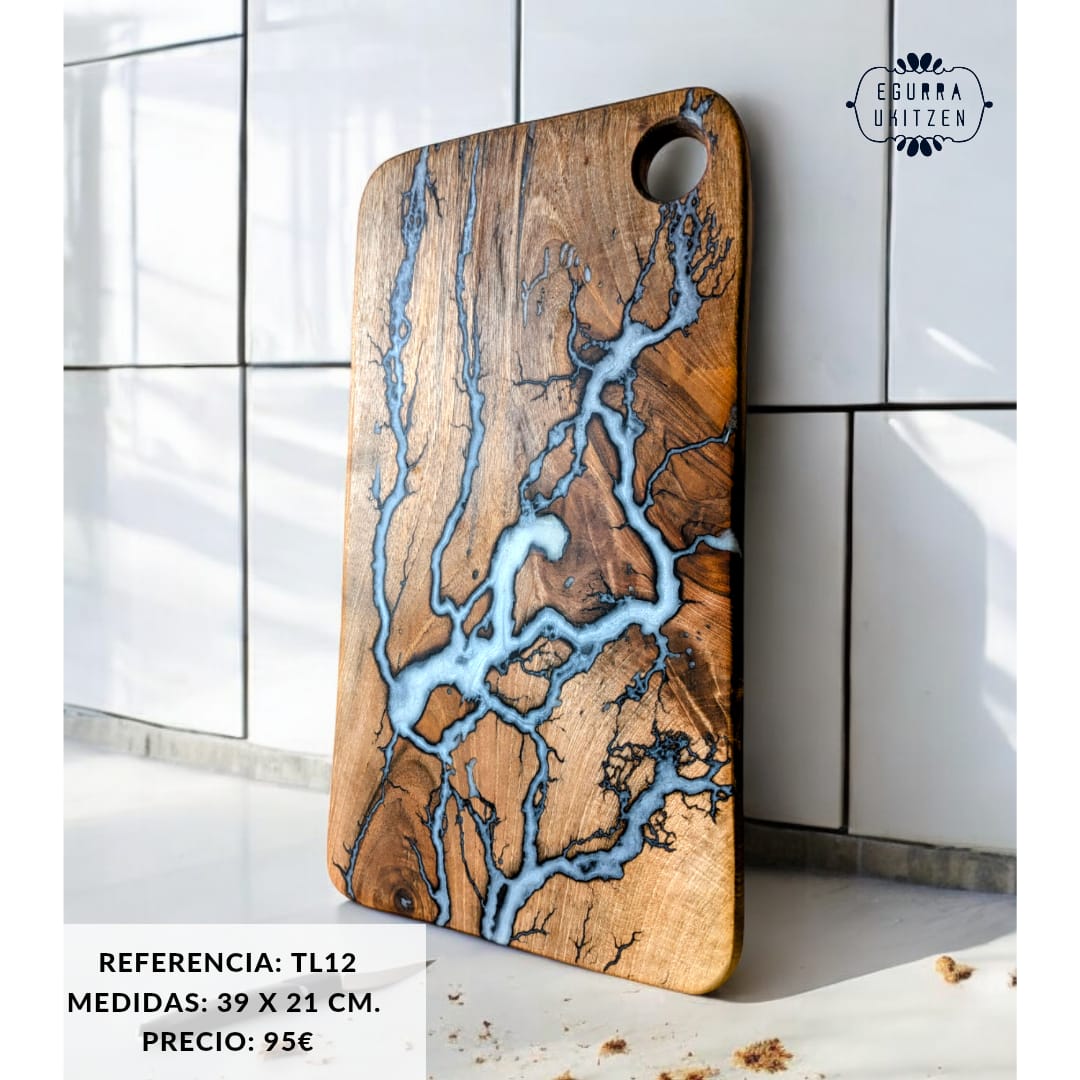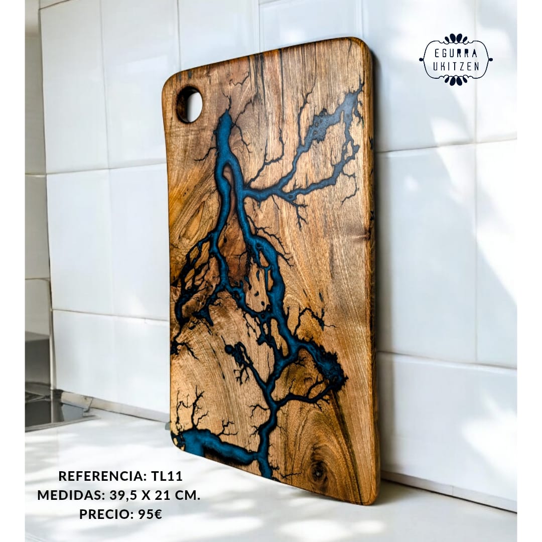 Cada pieza única está meticulosamente elaborada a mano con madera de nogal, destacando Figuras Lichtenberg en una de las caras, que le confieren un carácter distintivo. Las caras posteriores de cada tabla no suelen llevar resina, dando así la oportunidad de utilizar esta cara para el corte y la otra para servir.