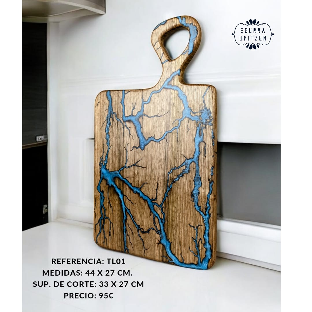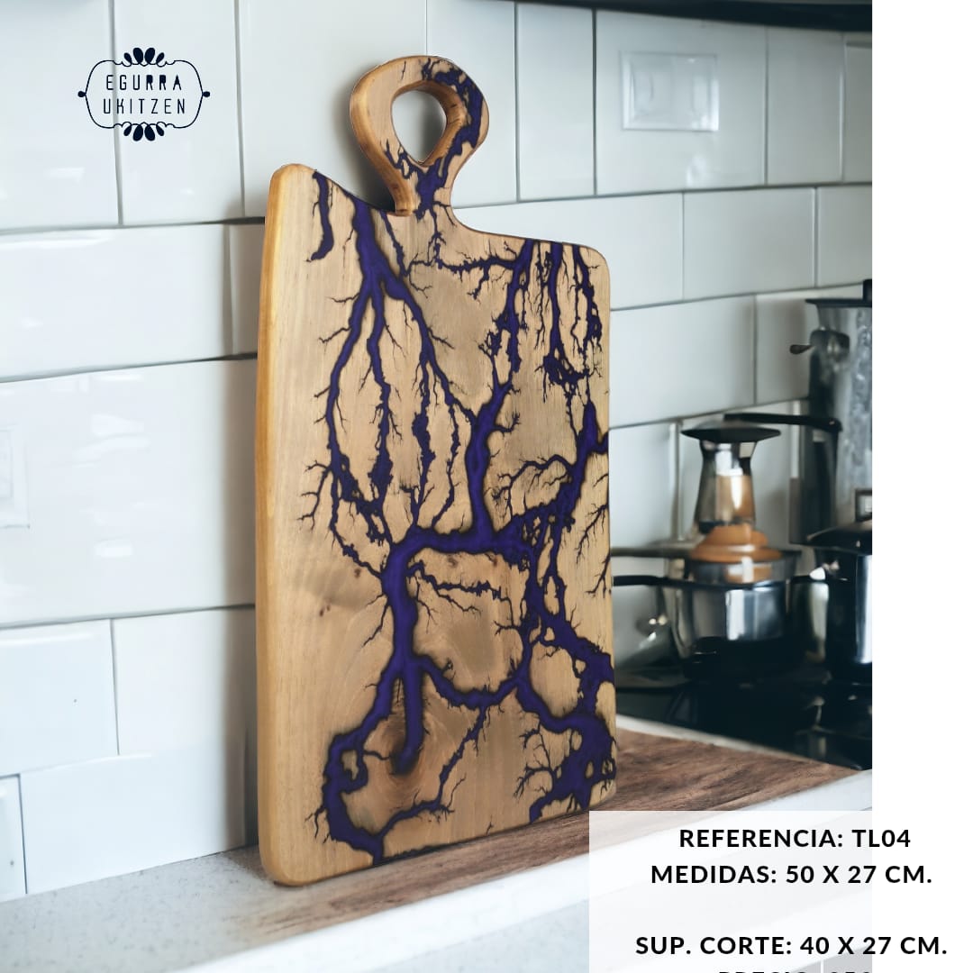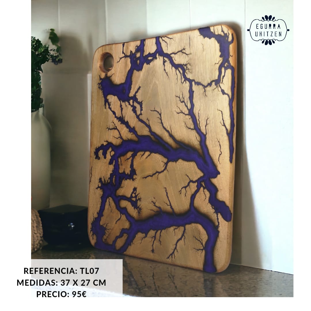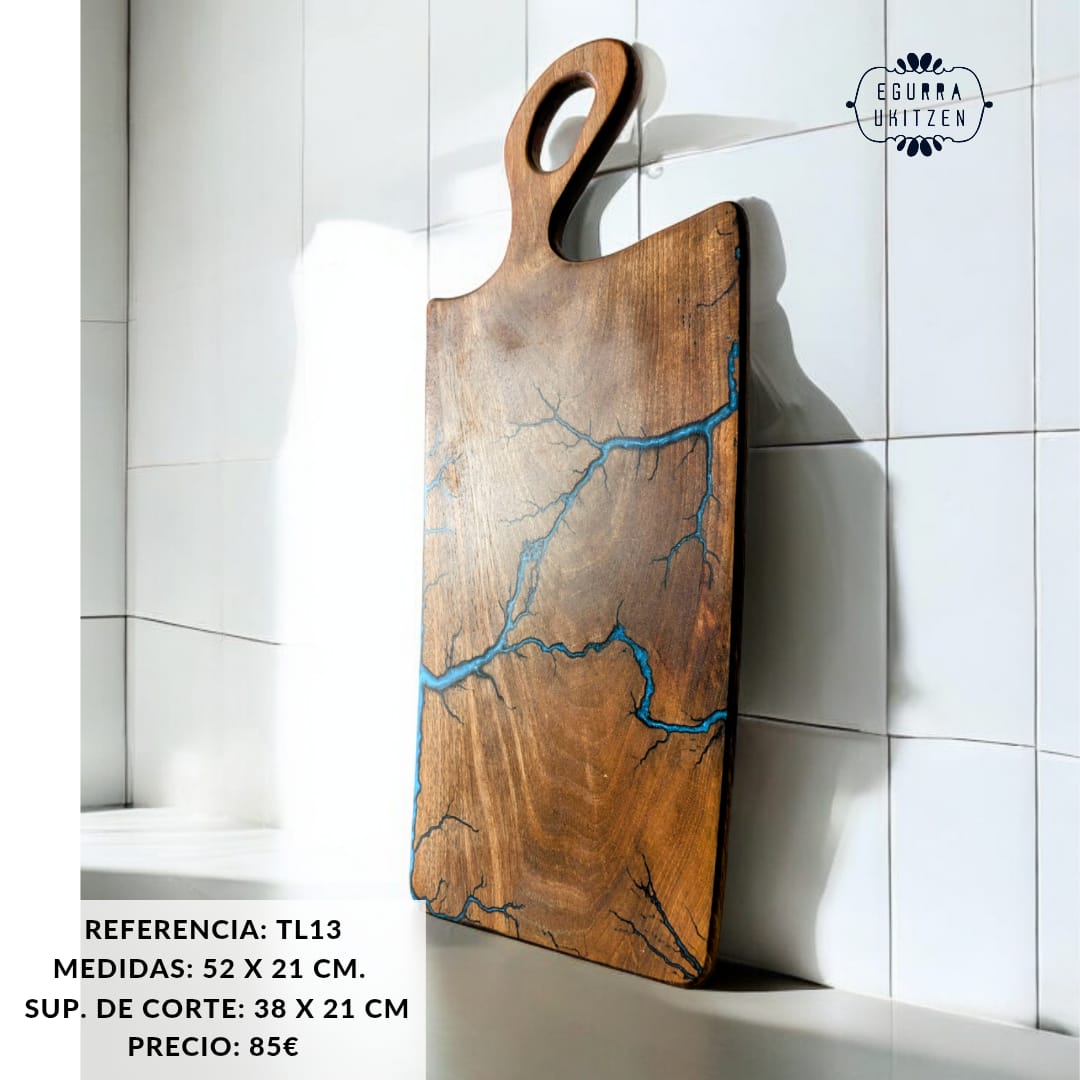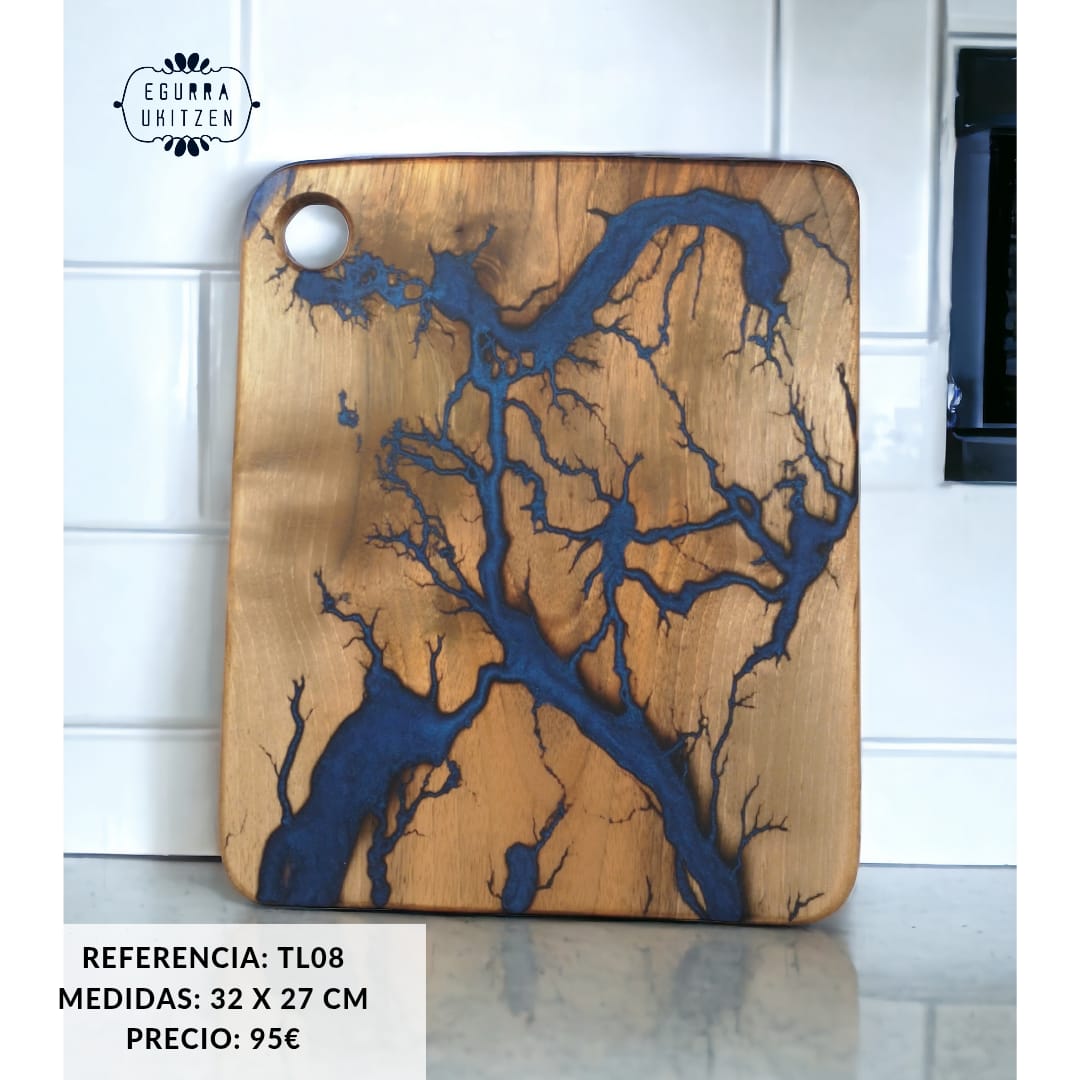 Cada pieza única está meticulosamente elaborada a mano con madera de nogal, destacando Figuras Lichtenberg en una de las caras, que le confieren un carácter distintivo. Las caras posteriores de cada tabla no suelen llevar resina, dando así la oportunidad de utilizar esta cara para el corte y la otra para servir.