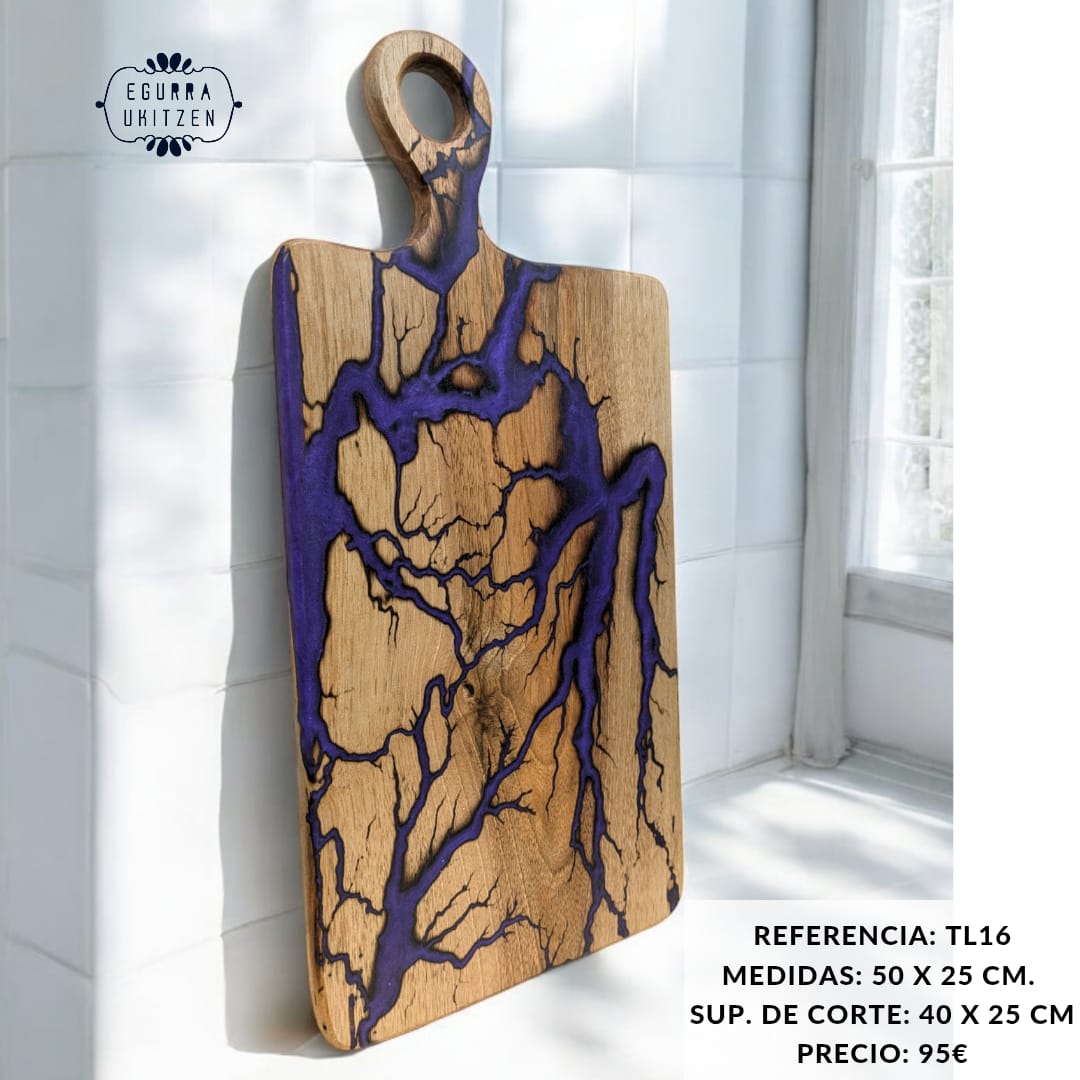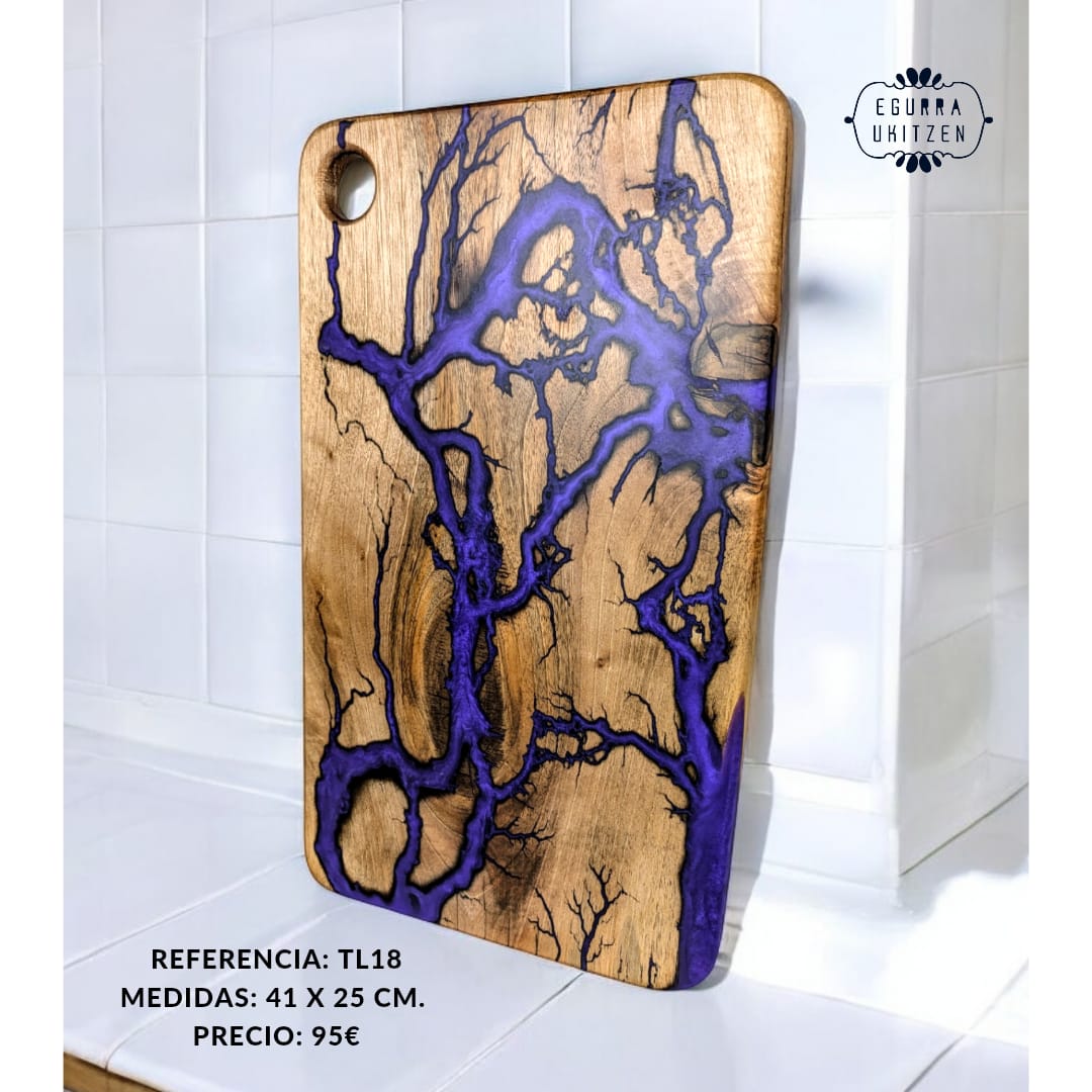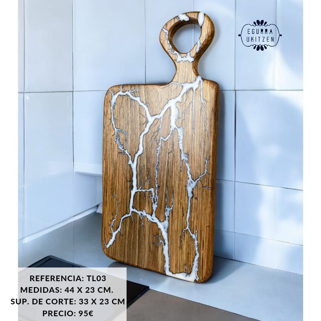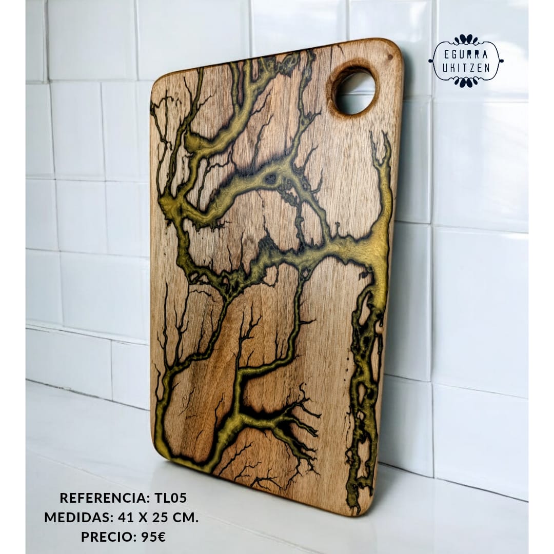 Cada pieza única está meticulosamente elaborada a mano con madera de nogal, destacando Figuras Lichtenberg en una de las caras, que le confieren un carácter distintivo. Las caras posteriores de cada tabla no suelen llevar resina, dando así la oportunidad de utilizar esta cara para el corte y la otra para servir.