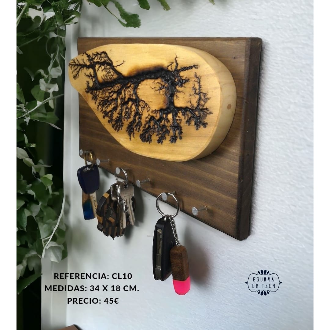Las figuras Lichtenberg son imágenes producidas por descargas eléctricas ramificadas, arborescentes. El nombre de la arborescencia viene debido al patrón que siguen las figuras, muy parecido a la morfología arbórea. Sin embargo, se ha descubierto que las ramificaciones, nada tienen que ver con el verde vegetal, más bien poseen propiedades fractales. Reciben su nombre debido a su descubridor, Georg Christoph Lichtenberg en 1777, y son figuras que se crean al someter grandes descargas eléctricas a materiales aislantes, en nuestro caso, madera. En nuestro canal de YOUTUBE mostramos vídeos de la realización de esta técnica tan bonita, como arriesgada. Con esta técnica elaboramos colgadores de llaves como estos, todos realizados con madera recuperada y totalmente desparasitada.