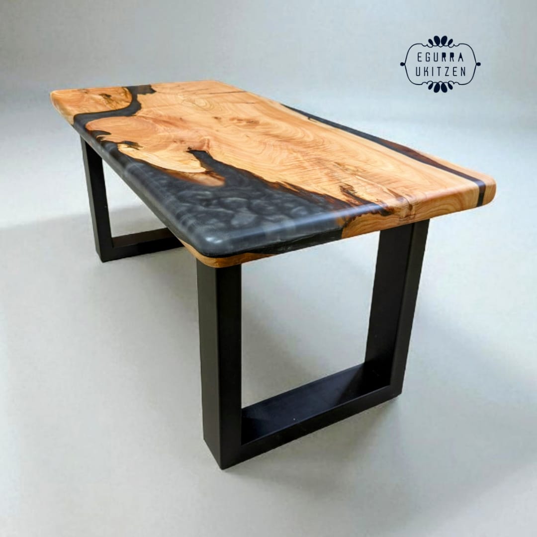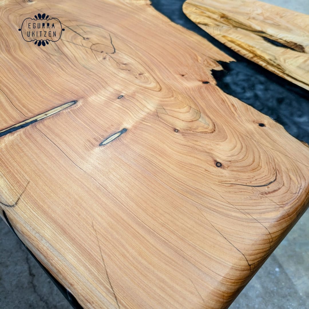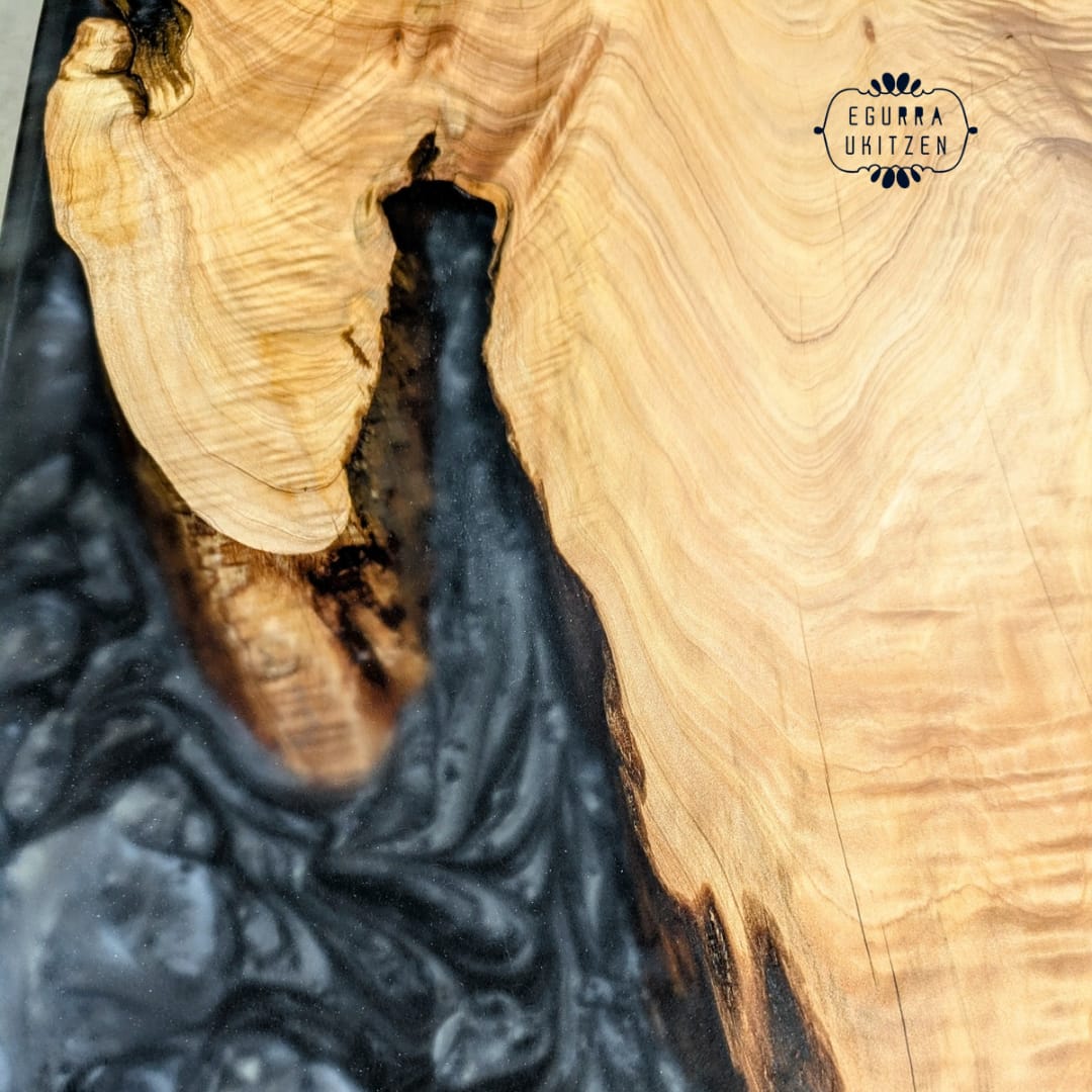 Esta pieza única combina la calidez natural de la madera de ciprés con la elegancia contemporánea de la resina negra metalizada. Su diseño orgánico resalta las vetas y texturas originales de la madera, mientras que la resina fluye entre ellas, creando un contraste sofisticado y armonioso.