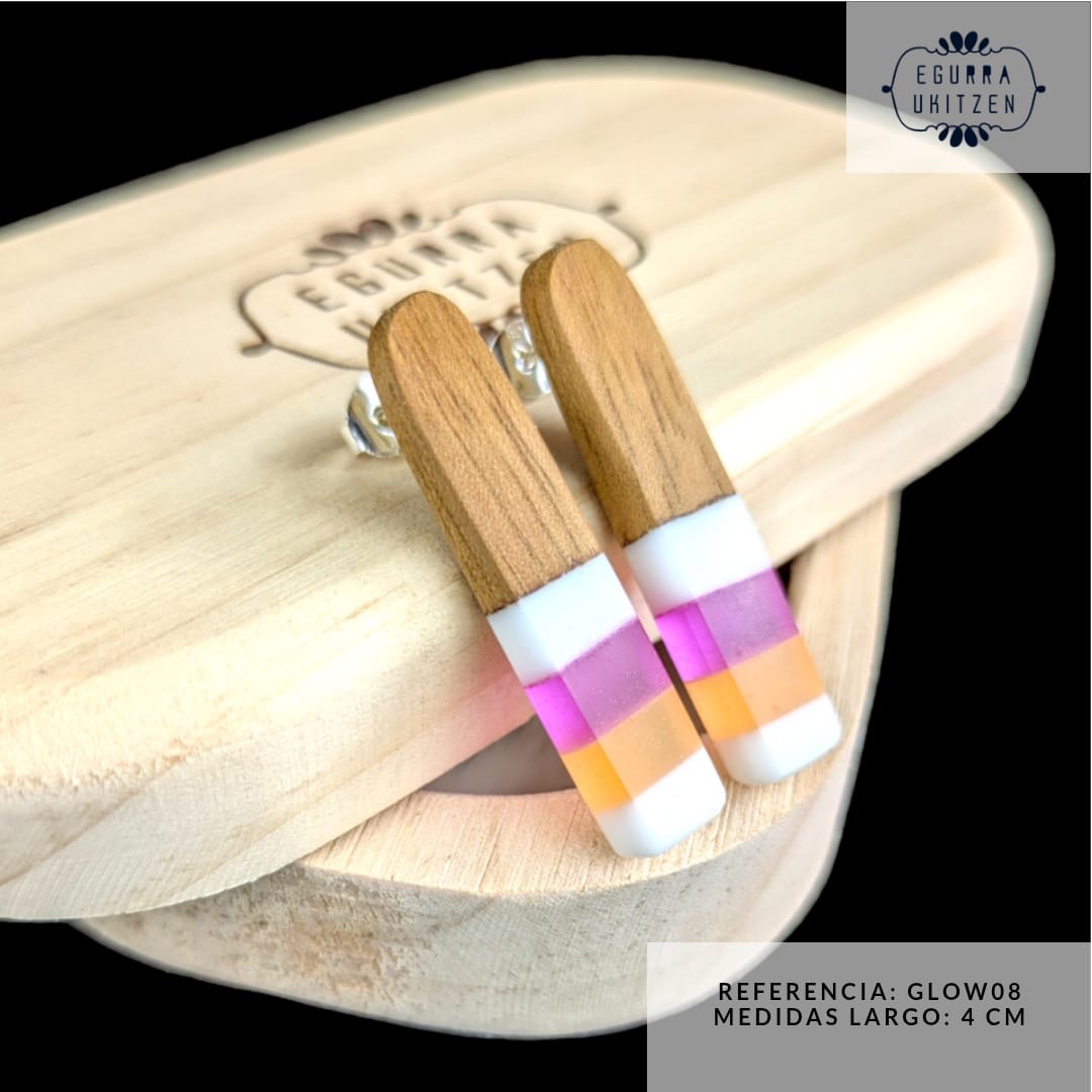 Luce un estilo único con estos pendientes artesanales de madera y resina. Su diseño moderno combina materiales naturales con franjas de colores vibrantes, ¡y lo mejor es que las franjas centrales brillan en la oscuridad!